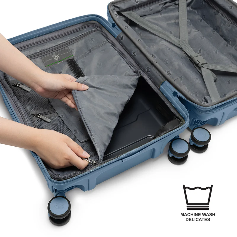 Introducing the ReNew Collection – EcoFriendly, modern lightweight luggage made from 100% recycled water bottle PET material. ReNew helps turn waste into a functional, durable, and sustainable product, while reducing environmental impact. The interior lining is also crafted from recycled PET and is removable for easy cleaning, keeping the interior fresh and looking like new.